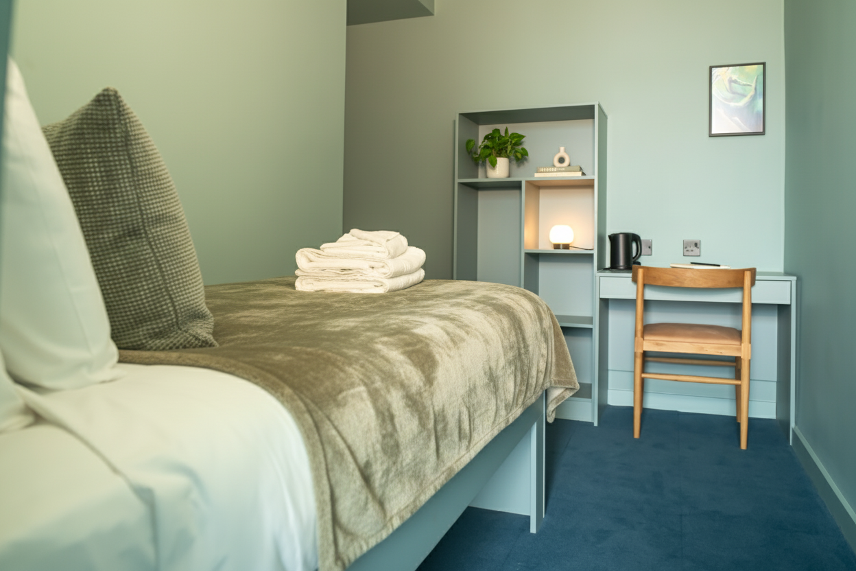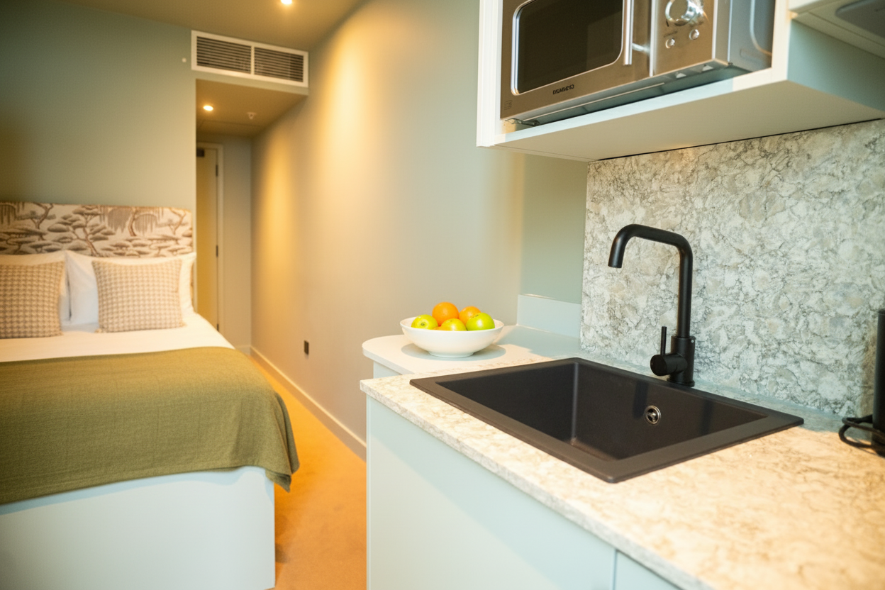 Our studio-style rooms come in 7 different categories - ensuite, snug, cosy, roomy, spacious, deluxe, as well as accessible for people with disabilities. You can also choose from 4 different themes based upon the elements - earth, air, water, or fire. They variously have kitchenettes, banquettes with dining tables, desks, vanities, and breakfast bars. All have ensuite bathrooms with rain showers, places to sit and work or eat, and a wardrobe.